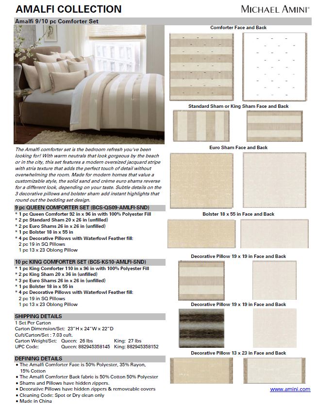 The Amalfi comforter set is the bedroom refresh you've been looking for! With warm neutrals that look gorgeous by the beach or in the city, this set features a modern oversized jacquard stripe with stria texture that adds the perfect touch of detail without overwhelming the room. Made for modern homes that value a customizable style, the solid sand and crème euro shams reverse for a different look, depending on your taste. Subtle details on the 3 decorative pillows and bolster sham add instant highlights that round out the bedding set design.