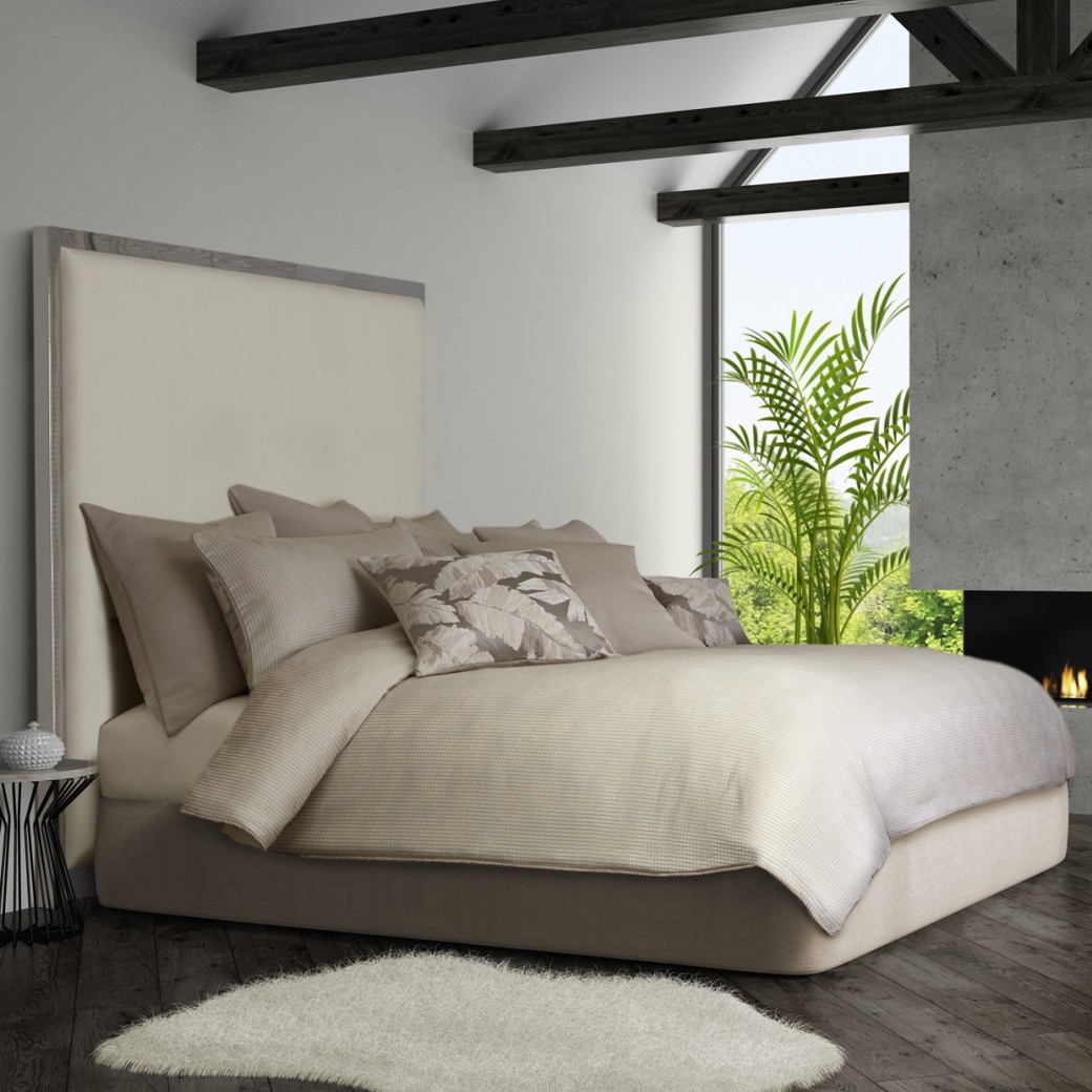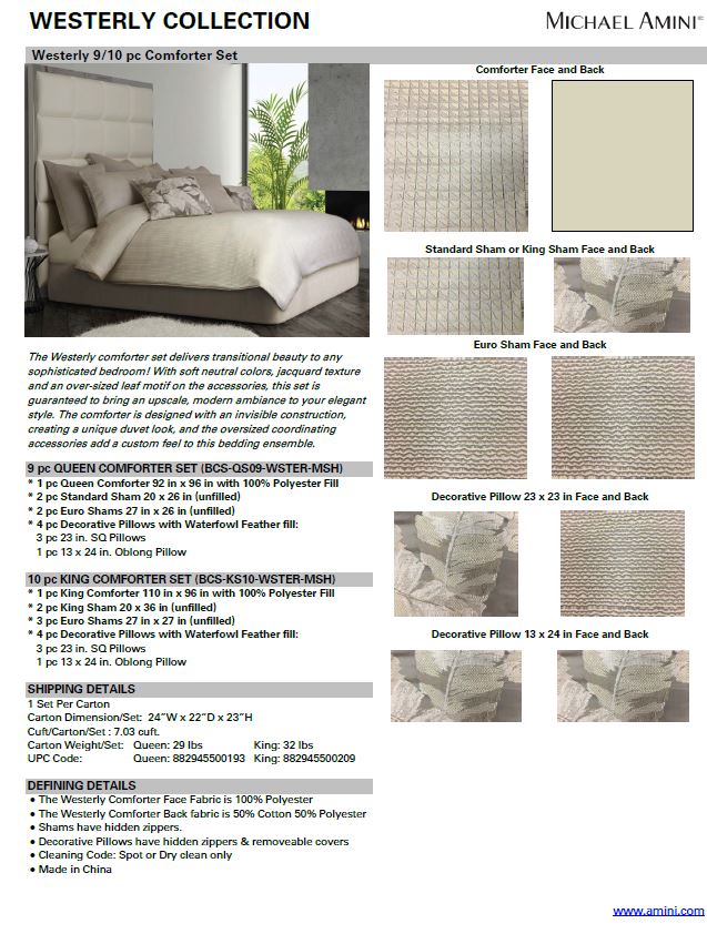 The Westerly comforter set delivers transitional beauty to any sophisticated bedroom! With soft neutral colors, jacquard texture and an over-sized leaf motif on the accessories, this set is guaranteed to bring an upscale, modern ambiance to your elegant style. The comforter is designed with an invisible construction, creating a unique duvet look, and the oversized coordinating accessories add a custom feel to this bedding ensemble.