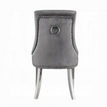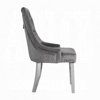 Contemporary flair graces classic silhouettes to create a timeless design that will blend with any home style. This Parson style side chair has an upholstered height back adorned by a sparkling nail-head border and a silver pull-ring, with button-tufted details and a diamond grid pattern for a luxurious comfortable look. Stainless steel legs highlight the chair with a subtle luster. Traditional elegance and modern glamour are in harmony with the Satinka Side Chair.