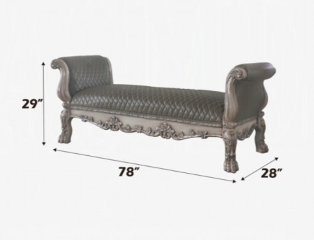 PRODUCT DETAILS: KD, Bench (Backless) * Stationary Seat * Padded SEAT: PU () * Raised Scrolled Moldings with Vintage Hand Brushed Contrast Finish (Poly-Resin) * Backless * Seat Construction: Wooden Scrolled Apron () * Oversized Claw Leg * Rolled Armrests