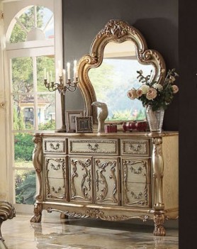 Dresden BONE PU & GOLD PATINA FINISH A new rendition to the classic Dresden, finished in gold patina, with a hint of gold. The antiqued look is further highlighted with a hand applied burnish. The bed is complemented by a thick, tufted upholstery surrounded with individual nail heads, in matching leather like PU.