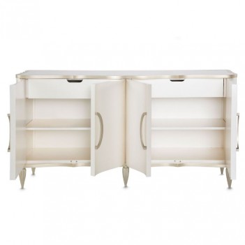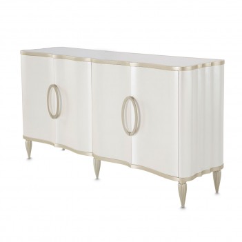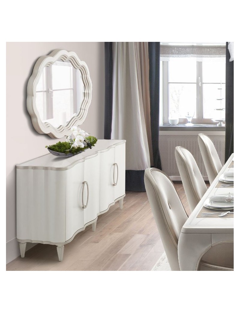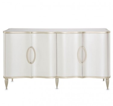 Set your dining room aglow with the London Place Sideboard! Sophisticated hardware, pearly finishes, and a scalloped design and make any space shine with classy style.
