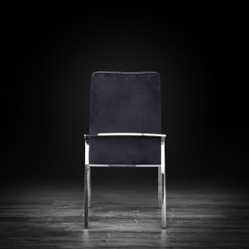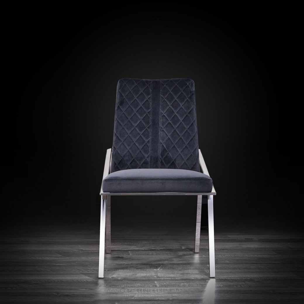 Nolan elegant dining chair features a quilted design detail on the back support. The chair has midcentury modern lines with elegant new materials. The velvet upholstery gives the chair a luxurious feel and look while the stainless steel finish on the frame adds a touch of contemporary to this elegant chair by Roberto Grassie. Available in Black and Gray colors.