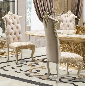 This solid wood dining table from the HD-903 collection by Homey Design features impressive pedestal base with carved refined details and gold finish creates a regal look. Oval tabletop is coated with delicate creamy tone with gold accents. The Chairs feature intricately carved cabriole legs and chair frame enhanced with gold-tone finish. Chairs are upholstered in soft creamy fabric, chair's cushion is enveloped with a delicate floral pattern. Chairs' back are enhanced with nail head trims.