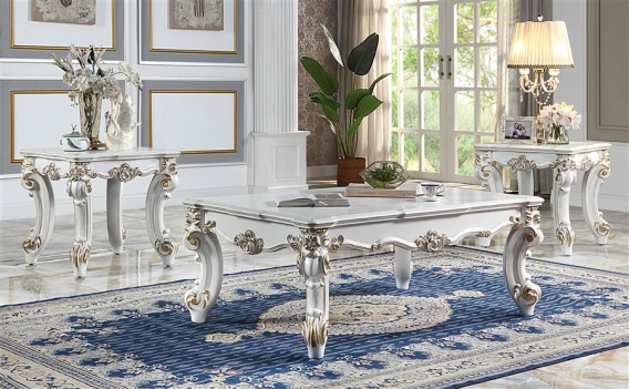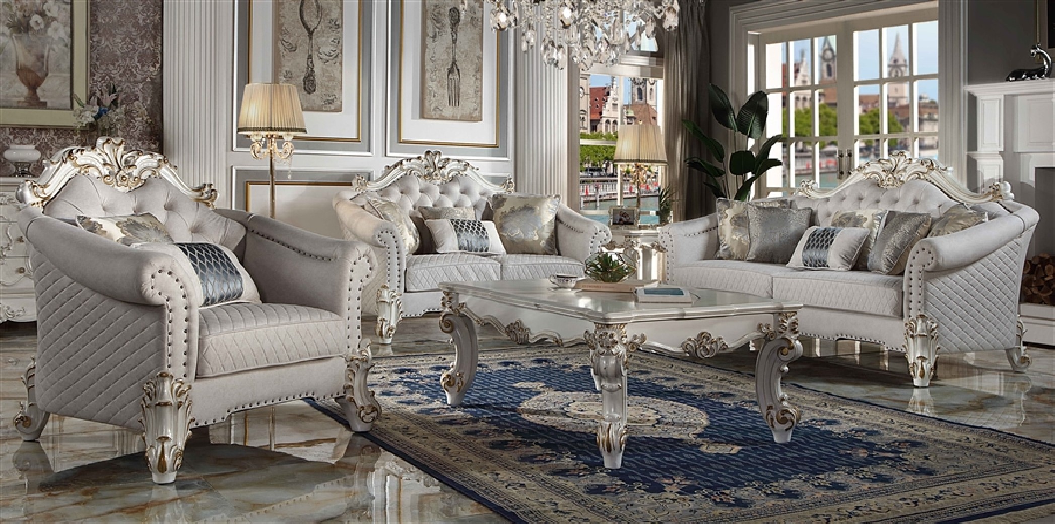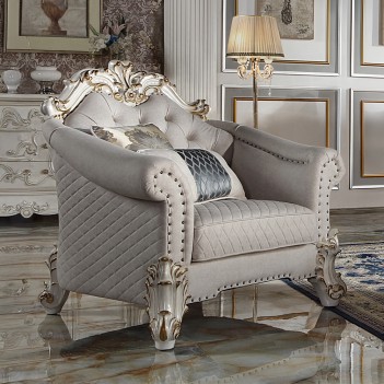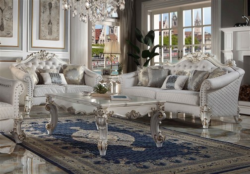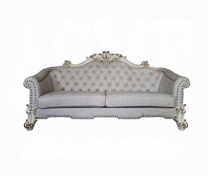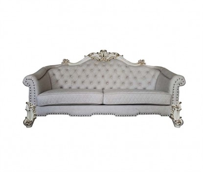 Vendome II TWO TONE IVORY FABRIC ANTIQUE PEARL FINSIH Tracing back to the classical Baroque era, expressed with intent and conviction, our new interpretation of Vendome II is donned. The Vendome II sofa’s two tone ivory fabric is grand and classy with crystal like button tufting on the back in a crackled gold patina finish richly accented with gold leaf brushed onto each piece by hand. The carved frame Decor and nailhead trim around the crown, arm, and base accentuate style and class. Pillows are included for additional comfort and support. Fully Assembled.