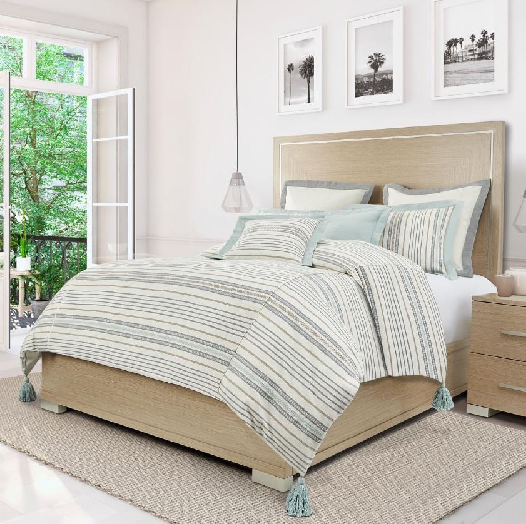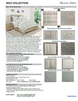 Create an atmosphere of tranquility with the Max duvet set! This beautiful design is all about relaxation and comfort with 100% cotton and cool, soothing tones. The eye-catching stripe design is achieved with woven jacquard that adds a small raised detail for ultimate texture and depth. The pattern is balanced by solid accents in ivory, aqua and gray, and the stylish flange borders on the shams and pillows add a charming flair to the whole look. The decorative pillows also have polyester fill and removable covers for ultimate convenience. The cotton-backed duvet is finished with a hidden button closure to secure a comforter insert (NOT included) within the duvet cover. This set is oversized for today's premium mattresses.