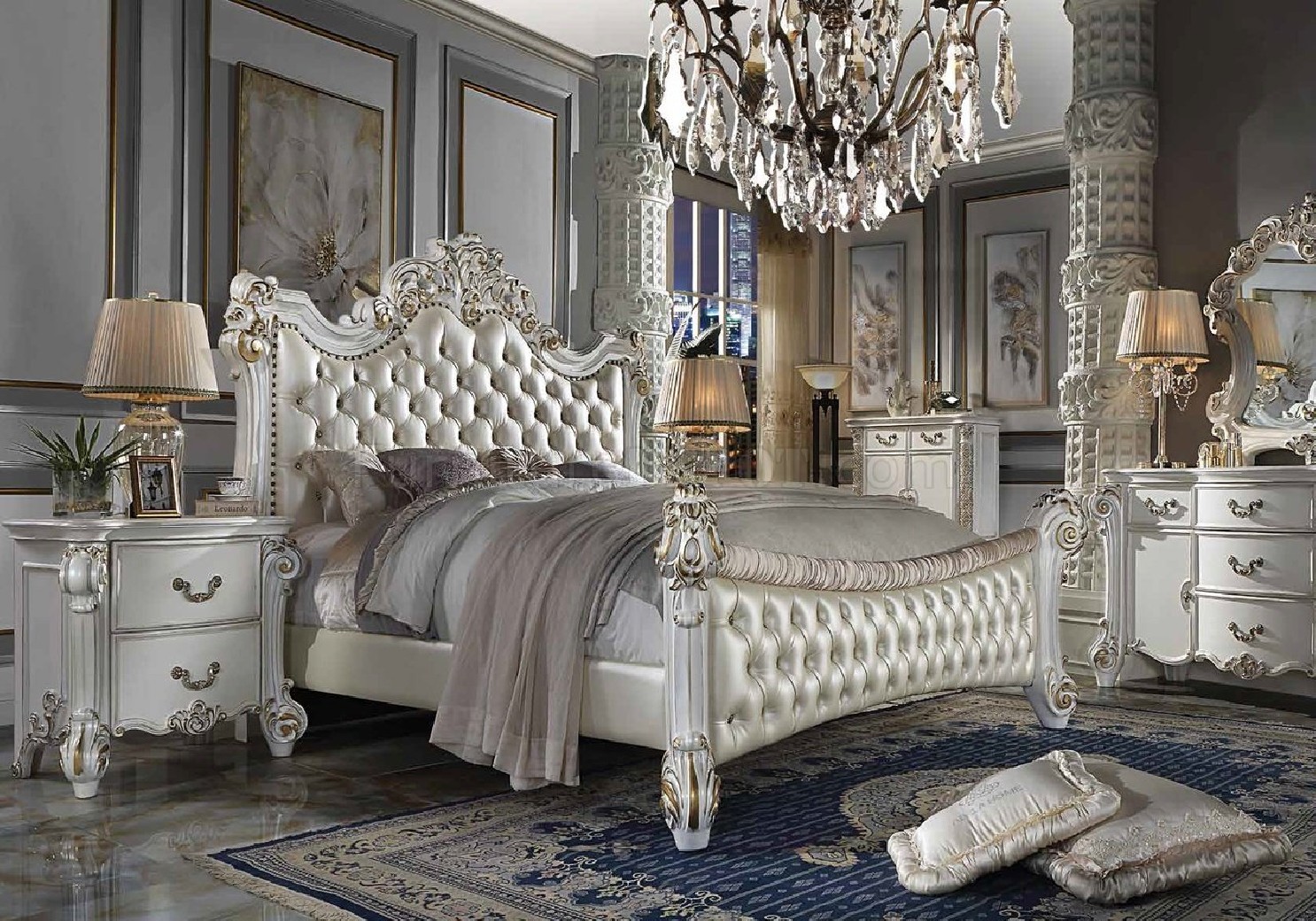 Dream happily-ever-after in a fairy-tale-inspired bed you have aspired to own all your life. This Vendome PU upholstered bed glints stylishly with its crystal-like button tufting and nail head trim, elegant hand-brushed gold is paired with an antique pearl. The PU upholstery adds Softness as the perfect finishing touch. Create serenity at home with the Vendome bed.