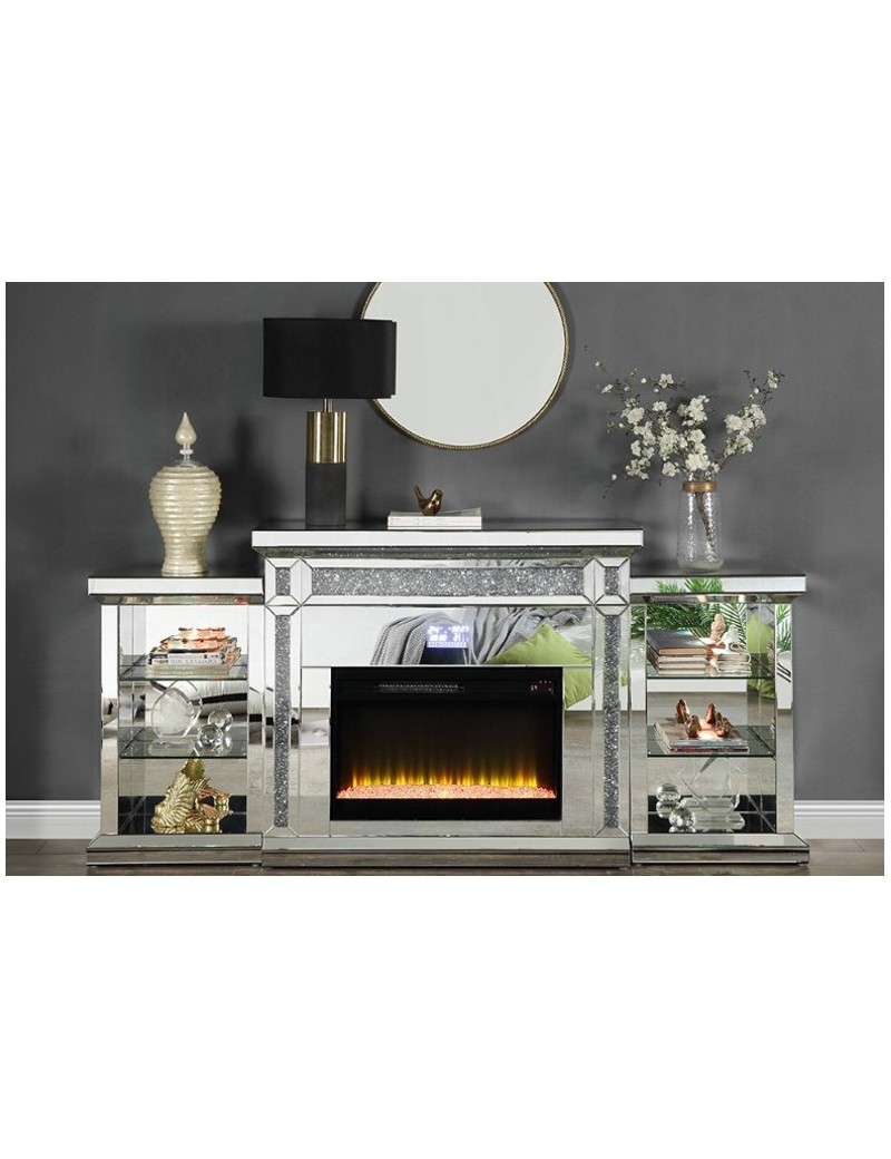 Framed with glimmering faux diamonds and encased by brilliant mirrors. The Noralie LED fireplace is sure to wow everyone. The lighted bookend shelves provide ample storage for reading materials, media accessories, or pottery. Control from anywhere in the room with the easy-to-use remote control. When you want to illuminate the room, but heat, turn on just the flames and enjoy year-round!