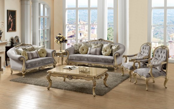 This beautiful wide, rolled arm, silver sofa with gray upholstery features an intricately detailed design. Its soft fabric provides a comfortable experience. Sure to add a classic look to any home.