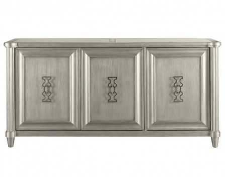 The three-door credenza brings together traditional fluted corner pilasters, mitered moldings and an inset stone top with the dramatic pop of custom metal filigree hardware. The credenzas three cabinets have adjustable shelves. Available in Thistle, a rich dark finish that shows off the beautiful grain of the wood, and in Smoke, a warm semi-transparent gray stain.