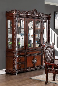 Bold and grand are some of the words that would describe this traditional dining set. Two pedestal bases hold the large table top adorned with intricate apron design. The chair backs play host to two different treatments--the armchair have button tufted leatherette, while the side chairs feature wooden backs with intricate carved details. Both chairs' front legs feature beautiful twisted rope carvings, details which they share with the optional hutch and buffet--it's the perfect setup for chinaware and memorabilia display.
