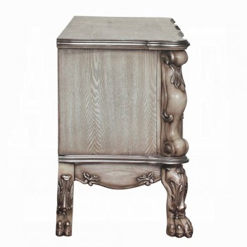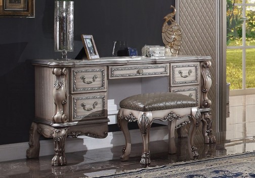 The Dresden vanity desk is a new rendition to a classic style, finished in antique white. The antiqued look is further highlighted with hand applied burnish. This desk features five drawers with detailed French front and back. This desk is sure to add style and functionality to any bedroom.