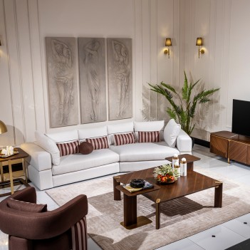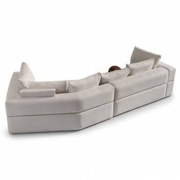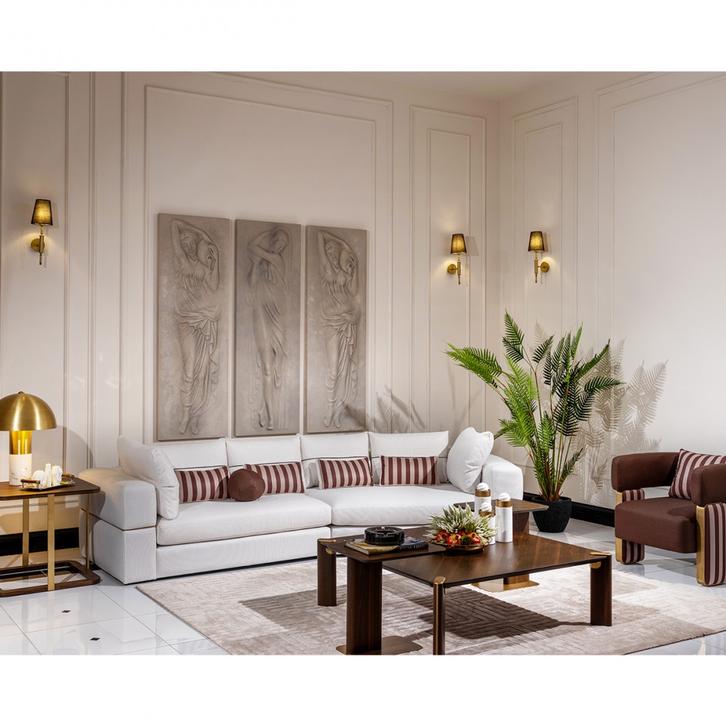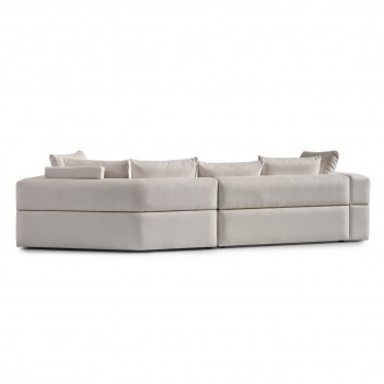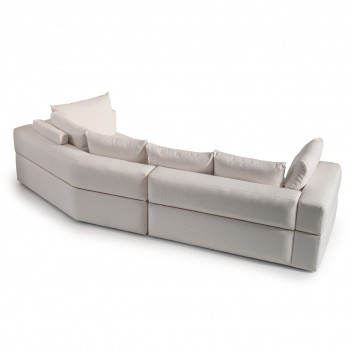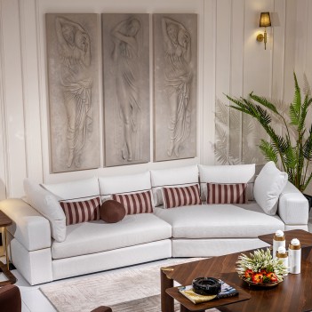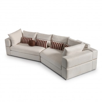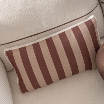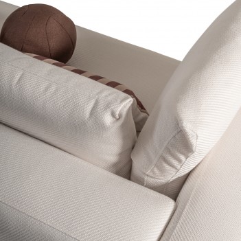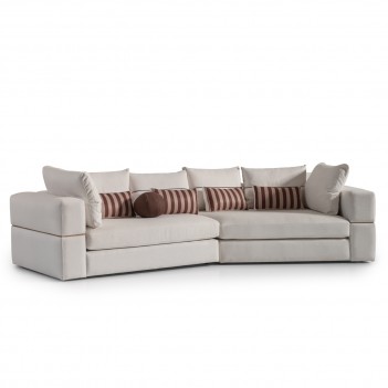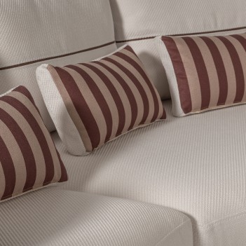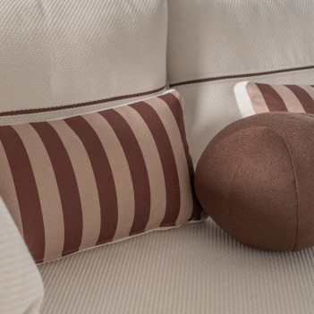 Transform your living space into a cozy oasis with this uniquely shaped sofa that beckons you inward for ultimate relaxation. Sink into the plush back and arm cushions while the striking chocolate-striped pillows provide a delightful contrast to the soothing oatmeal body. And let's not forget the irresistible chocolate ball pillow, just waiting to be cuddled!