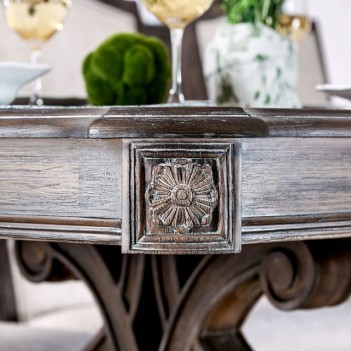 as it is chic. This sophisticated table features intricately carved crests along the skirt of table to accentuate its