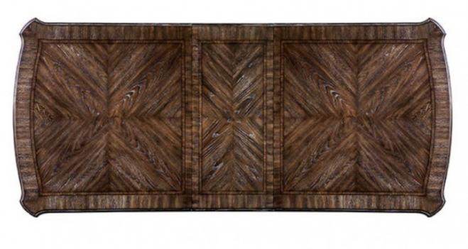 Beautiful wood inlay details and a dramatic Trestle base create a grand statement with elegance galore. The