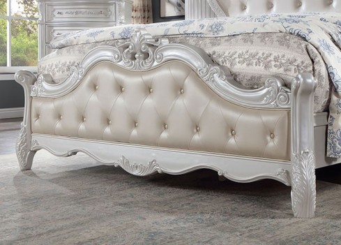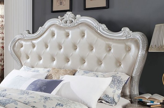 Right at first glance, the opulence of this set is undeniable. Both headboard and footboard are imposing in size with their centerpieces made of padded button-tufted flannelette, framed perfectly by intricate faux wood carvings straight out of the baroque era. The matching case goods share the same over-the-top details and lustrous, pearl white finish. For the night stand and dresser, the tops are made of genuine marble—because nothing says luxury like the real thing.
