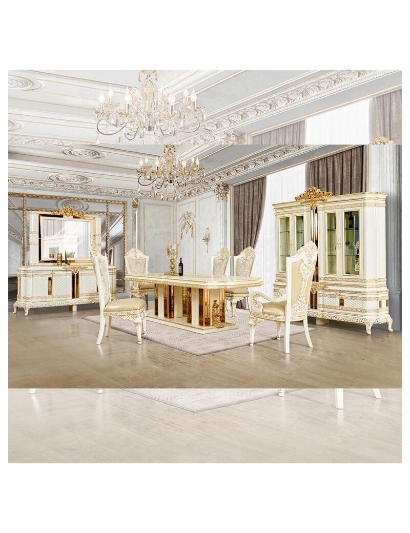 Entertain in elegance with this beautiful HD-1882 Dining Room collection. Dining table features a beautiful scrollwork glass-covered centerpiece, while the dining chairs feature a beautifully soft champagne gold leather seat and silk embroidered backrest.