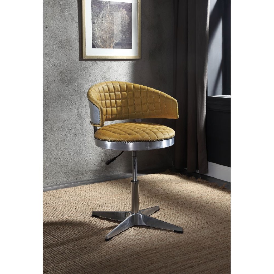 The Brancaster adjustable chair with swivel offers a dazzling, high-altitude seat that's sure to liven up any style of room design you have in mind. This stool is built with a metal frame that features a 4-star base with casters in a polished chrome finish. The outer shell of the seat is accented with a rivets. This comfy swivel chair has a pneumatic lever for height adjustment, and soft round padded seat & backrest upholstered in turmeric top grain leather.