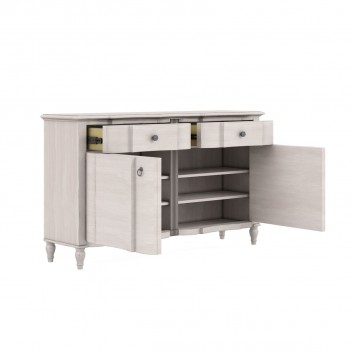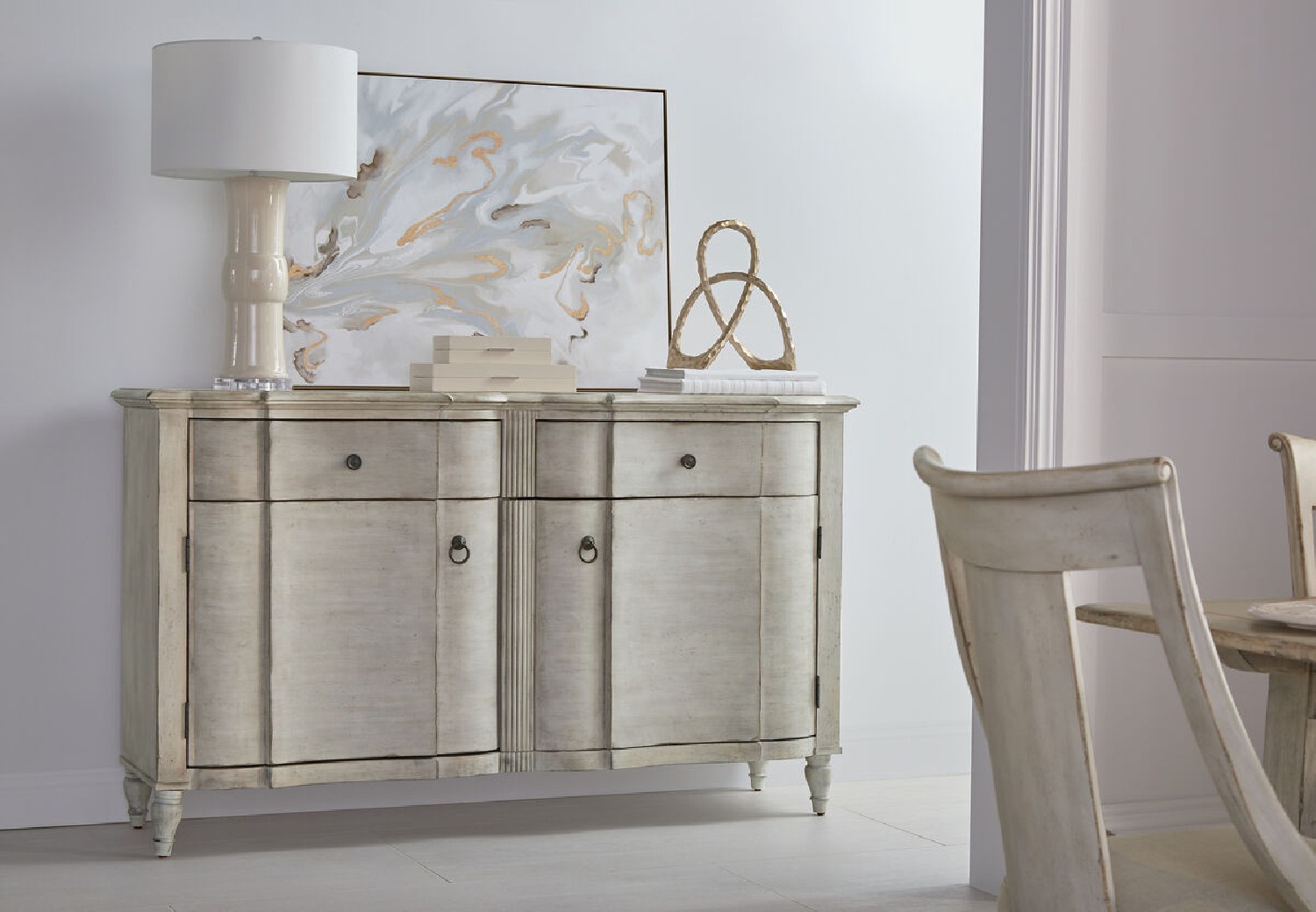 Enhance your dining room with the Alcove Buffet, a stunning piece that combines traditional style with exceptional craftsmanship and relaxed finishes. Featuring shapely drawer and door fronts with reed detailing in the middle of the case, this buffet exudes sophistication and offers ample storage for your dining essentials. With its felt-lined drawers, adjustable shelves, turned wood legs, and burnished brass hardware, this buffet is a testament to both beauty and practicality.