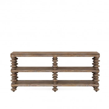 The elegant turned legs of the Architrave Console Table, a hallmark of the neoclassically-inspired Architrave collection, support a 72-inch top and two open shelves that can be used for storage or display. This handsome piece combines historical form and rustic charm in a casual classic style, and can be used as a narrow table behind a sofa or in a hallway.