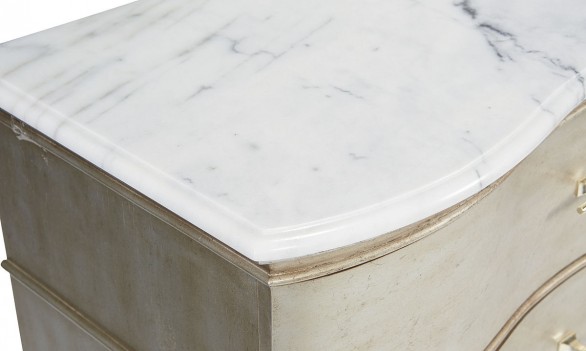 The handsome Starlite Bachelor Chest has three roomy drawers set into a gently curved serpentine front. The top of the chest is highly figurative polished stone; the body is finished with silver Bezel paint that has been glazed and gently aged for a soft sheen.