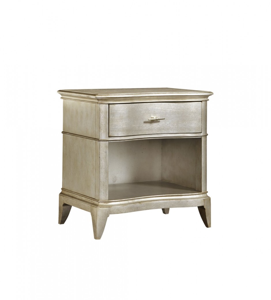 The Starlite Open Nightstand has a single drawer and a generously sized open cabinet, plus a hidden USB port in back. The nightstand is finished with silver Bezel paint that has been glazed and gently aged for a soft sheen.