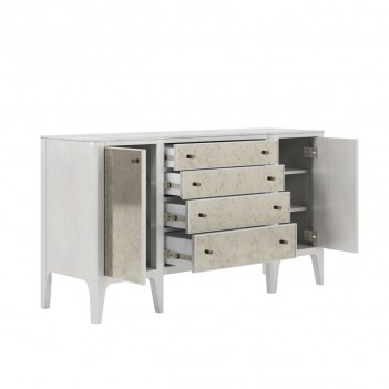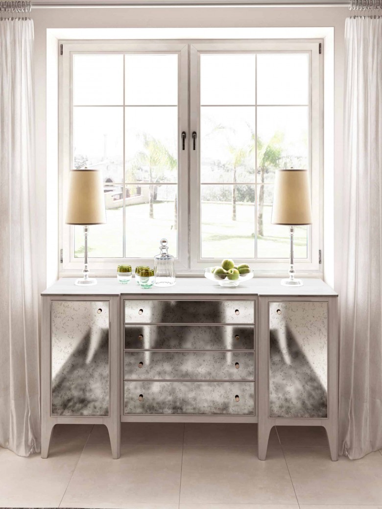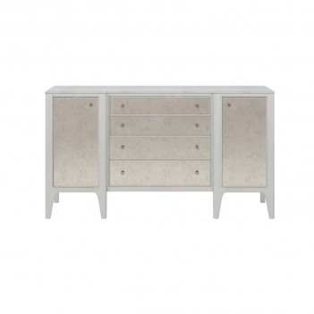 Introduce a little glamour to the dining room with this elegant dove gray buffet, including four central drawers flanked by a door on each side, that offers plenty of storage space for all your entertaining essentials. This piece also features a luxurious stone top and nickel hardware, as well as the antiqued mirror fronts that are the hallmark of this collection.