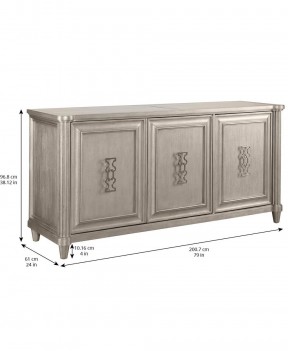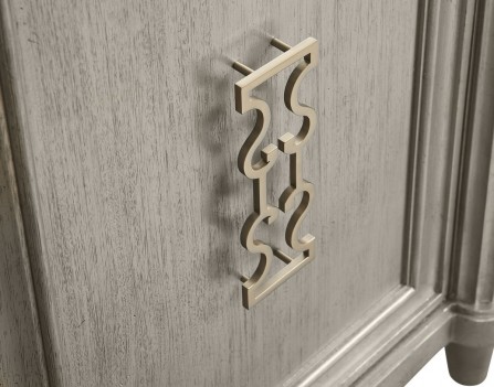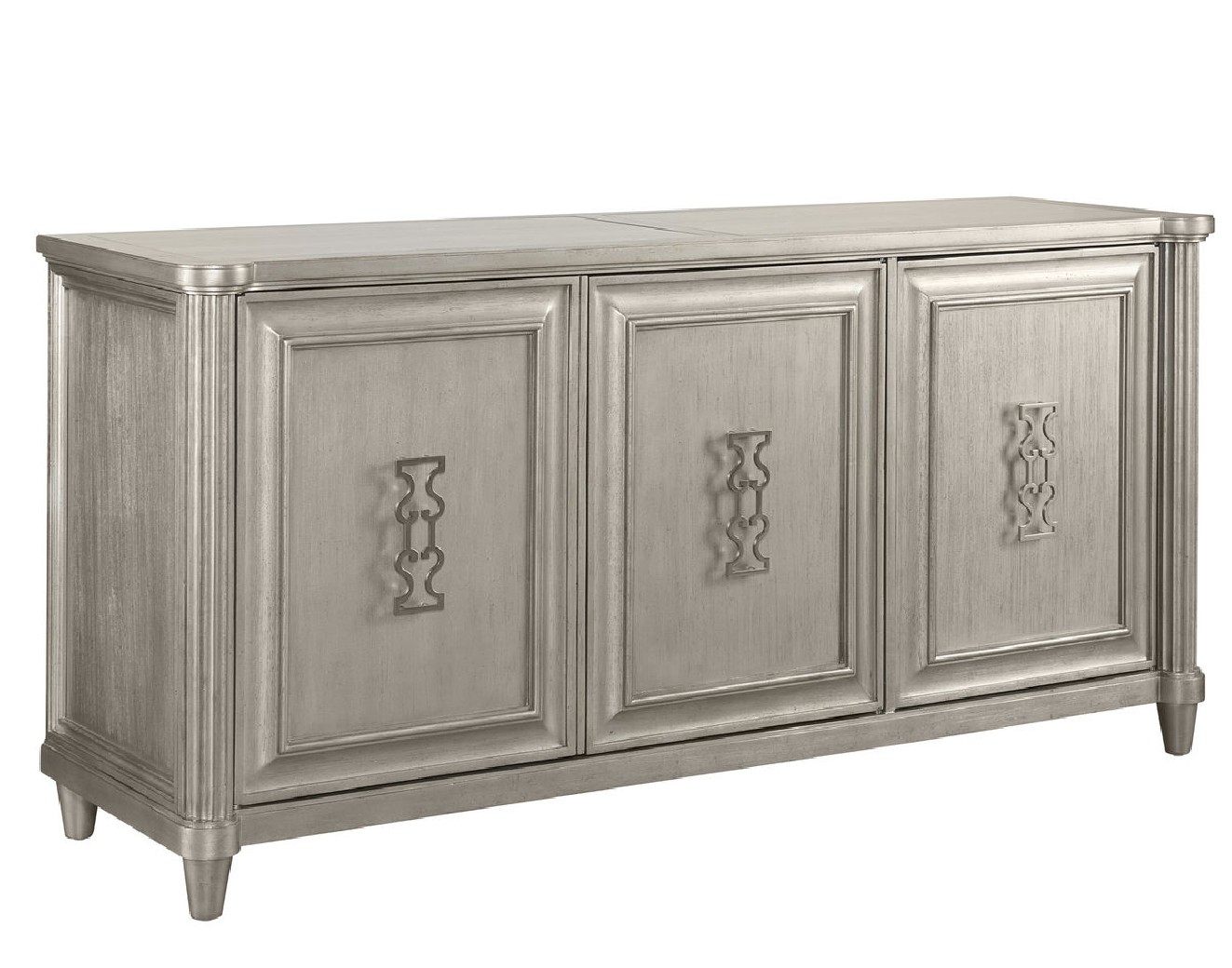 The three-door credenza brings together traditional fluted corner pilasters, mitered moldings and an inset stone top with the dramatic pop of custom metal filigree hardware. The credenzas three cabinets have adjustable shelves. Available in Thistle, a rich dark finish that shows off the beautiful grain of the wood, and in Smoke, a warm semi-transparent gray stain.