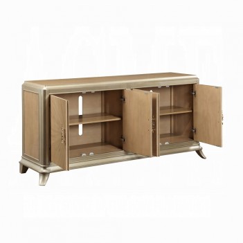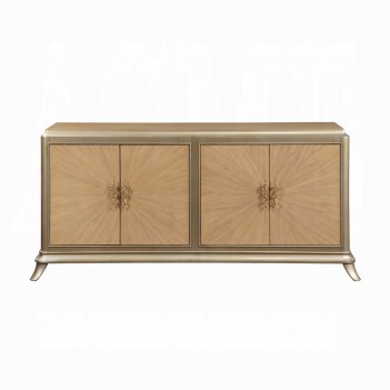 A two-tone oak finish sunburst effect brings exquisite personality to this Dodie console cabinet. Four large double cabinet doors offer plenty of space for storage in an entryway or living area. Behind each set of double doors, there is one adjustable shelf and a cable management cut-out. This piece is supported on slopped and tapered legs. The cabinet doors remain shut with magnetic closures. The lovely combination of oak and taupe champaign finish provides an unforgettable contemporary flair.