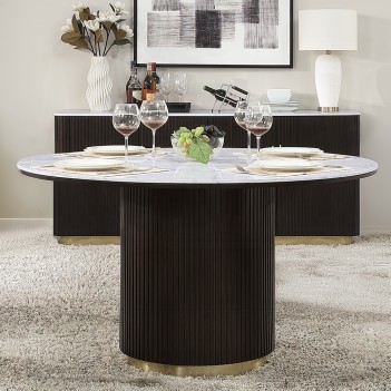 The Clayten collection features a round dining table with a fixed marble top, supported by a single pedestal base adorned with metal trim. Accompanied by upholstered chairs and a server with sleek metal legs, this set combines modern elegance with timeless sophistication. Perfect for intimate gatherings, the Clayten collection transforms your dining area into a stylish and welcoming space for cherished moments and delightful conversations.