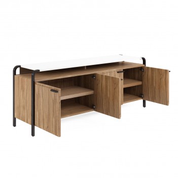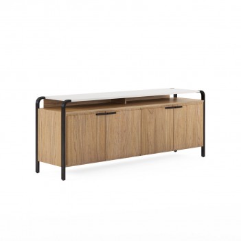The art of entertainment has never felt so effortless. This attractive two-tone console features a sleek white top and lower compartment featuring natural wood grain finished in warm acacia brown. Four doors reveal adjustable shelves, with convenient wire management cutouts for electronic devices and plenty of storage for all your living room entertainment essentials.