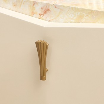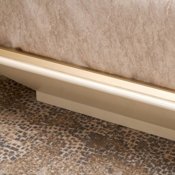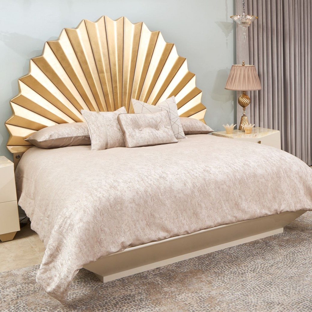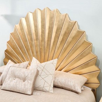 The Fantosini Fan Bed is a bold celebration of sculptural design and high-glamour finish. The dramatic fan-shaped headboard radiates outward in a dazzling display, finished in gold leaf to create a glowing, dimensional effect that captures and reflects light throughout the room. Its grand form is balanced by a sleek platform base in a creamy pearl finish, elegantly trimmed in gold for a cohesive, luminous palette. Designed to command attention from every angle, this bed transforms the bedroom into a personal sanctuary of luxury.