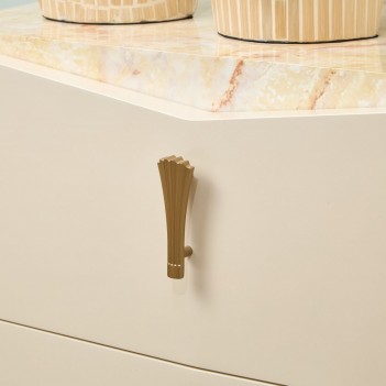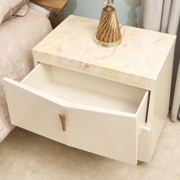 A jewel beside the bed, the Fantosini Gold Nightstand captures the essence of quiet luxury. Its sculpted silhouette is artfully angled, bringing a sense of movement and sophistication to the bedroom. The creamy pearl lacquer finish lends a soft, radiant glow, while the onyx-look top shimmers with marbled veining, creating the perfect setting for a chic lamp or décor. Two drawers glide open smoothly with velvet-lined bases, keeping your essentials close at hand and beautifully stored.