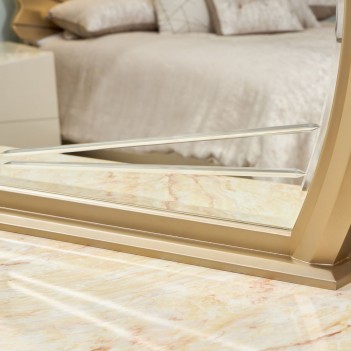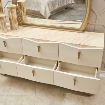 Sculptural elegance meets timeless glamour in the Fantosini Gold Dresser & Mirror Set. The dresser’s gracefully angled silhouette is finished in a lustrous creamy pearl lacquer, creating a soft yet luminous foundation. Its radiant onyx-look top evokes the richness of polished stone, offering an exquisite surface for statement décor. Above, the generously scaled round mirror is framed in brushed gold, perfectly echoing the dresser’s signature hardware. Intricate engraving across the mirror’s lower edge adds a tailored detail that reflects light with quiet brilliance—bringing depth, balance, and a touch of artistry to any luxury bedroom.