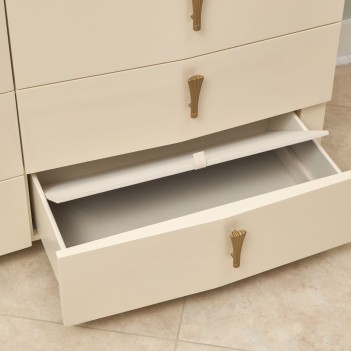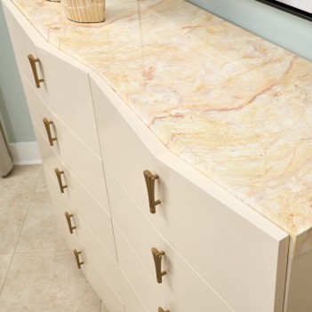 Striking from every angle, the Fantosini Gold Chest brings form and function together in a silhouette designed to elevate your space. Its subtly faceted front draws the eye with a graceful angularity, while the creamy pearl finish exudes quiet opulence. The top surface, crafted in a radiant onyx-look design, introduces a luxurious contrast—perfect for displaying curated décor. Ten spacious drawers provide practical storage with indulgent touches like velvet-lined bottoms and sculpted gold hardware.