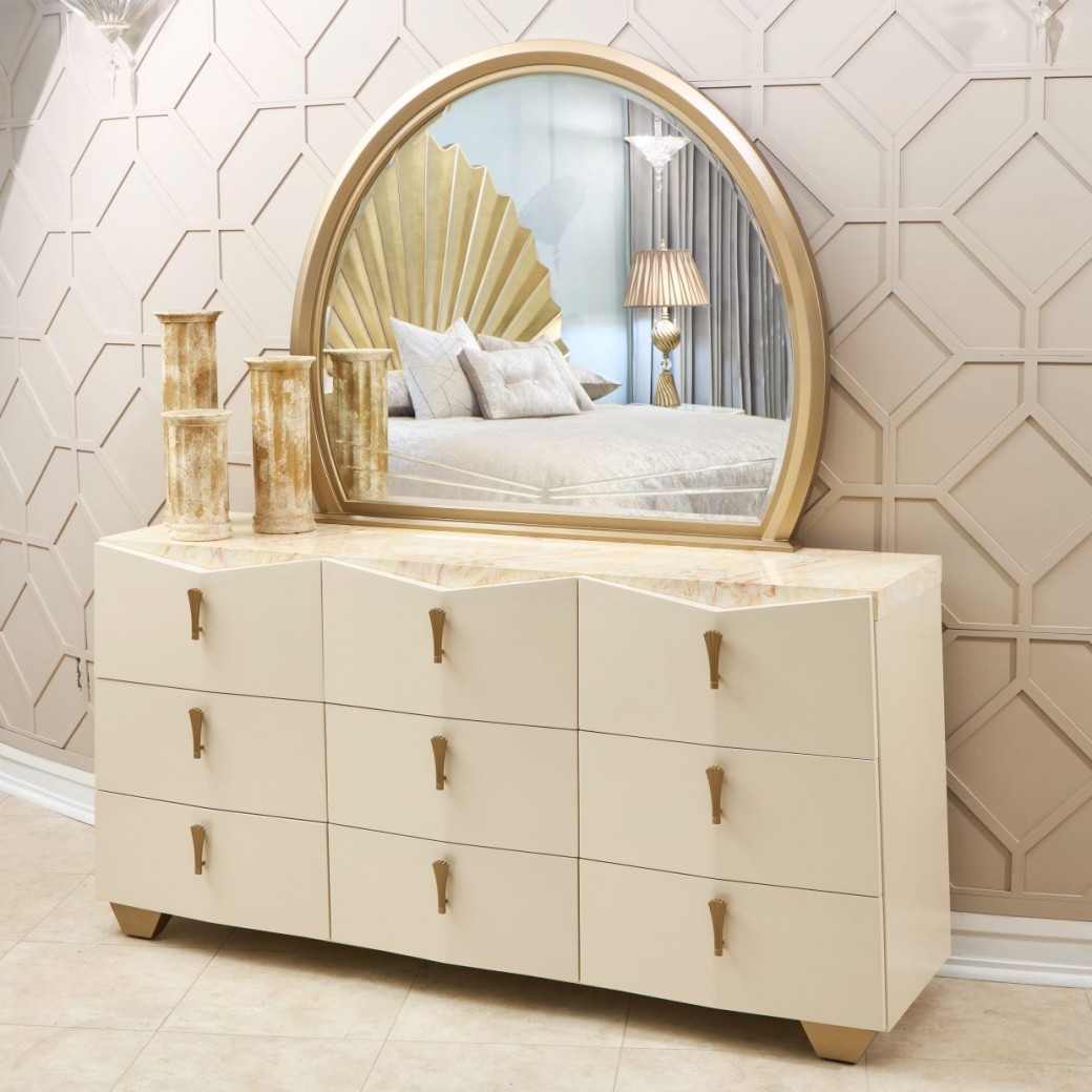 Sculptural elegance meets timeless glamour in the Fantosini Gold Dresser & Mirror Set. The dresser’s gracefully angled silhouette is finished in a lustrous creamy pearl lacquer, creating a soft yet luminous foundation. Its radiant onyx-look top evokes the richness of polished stone, offering an exquisite surface for statement décor. Above, the generously scaled round mirror is framed in brushed gold, perfectly echoing the dresser’s signature hardware. Intricate engraving across the mirror’s lower edge adds a tailored detail that reflects light with quiet brilliance—bringing depth, balance, and a touch of artistry to any luxury bedroom.