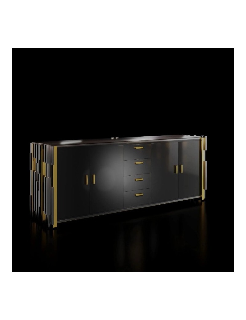 Experience elegance and modern sophistication with the Illusion Large Buffet by Roberto Grassie. This luxury buffet features a sleek, high-gloss black lacquered finish on doors, and drawers, black glass top, creating a stunning focal point for any dining room. The smoked black titanium gold frame and matching titanium gold handles add a touch of glamour, blending contemporary style with timeless design. With two spacious doors and four smooth-gliding drawers, this buffet offers ample storage for dinnerware, linens, and other essentials. Perfectly crafted for those who value both style and functionality, the Illusion Large Buffet elevates any dining space with its striking modern appeal.