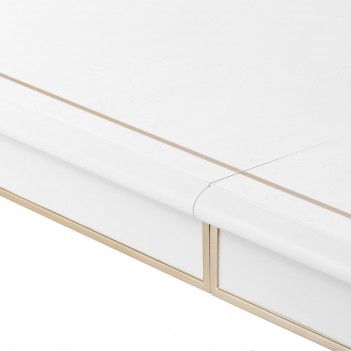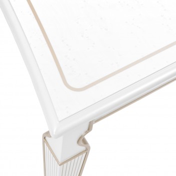 Elevate your dining experience with a table that embodies timeless sophistication. Finished in a luminous pearl hue with champagne gold accents, the La Marisia Dining Table is a statement of refined taste. The Birdseye maple veneer top showcases a delicate painted accent, emphasizing the table’s subtly inverted silhouette. Raised detailing along the apron and legs enhances its sculptural beauty, while tapered legs with reeded accents create a sense of graceful symmetry.