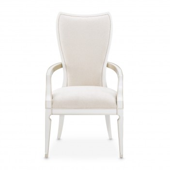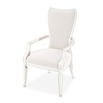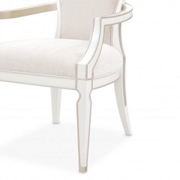 Refined elegance and comfort come together in the La Marisia Dining Armchair. Wrapped in sumptuously soft chenille, its understated hue enhances the chair’s graceful presence. The sculpted frame, finished in pearl with champagne accents, highlights the gentle curves and flowing lines. Thoughtful welting accentuates its silhouette, while the elegantly curved arms bring an added touch of sophistication. Supported by solid rubberwood wood legs, this chair offers both stability and a timeless aesthetic.