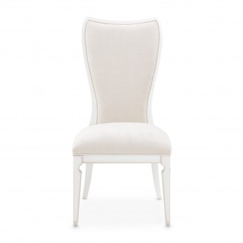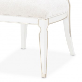 Timeless elegance meets refined comfort in the La Marisia Dining Side Chair. Upholstered in sumptuous chenille, this chair offers a soft, inviting seat in an understated hue. The pearl-finished frame with champagne accents enhances its sophisticated silhouette, while delicate welting detail highlights its graceful contours. Designed for both beauty and comfort, this chair is the perfect complement to an exquisite dining space.