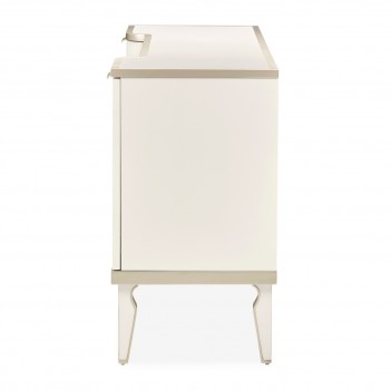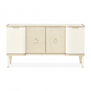 A statement of sophistication, the La Marisia Sideboard combines striking textures with graceful details. The pearl finish, accentuated by champagne gold, enhances its sculpted silhouette, while a luxurious cultured marble top provides an elegant surface for décor and serving essentials. The central doors are adorned with faux-shagreen panels, offering a rich contrast to the softly ribbed side doors. Three spacious cabinets with adjustable shelving provide tailored storage solutions, while two distinct hardware styles—delicate champagne gold handles and artful fan-shaped pulls—add a final touch of distinction.