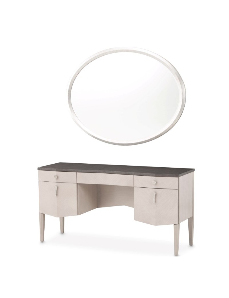 A curated masterpiece of modern elegance, the Fantosini 3-Piece Vanity Set blends sculptural design with refined finishes to create a truly glamorous dressing space. The vanity desk features a softly angled silhouette wrapped in oak veneers and crowned with a smoky contrasting top. Five soft-close drawers offer graceful storage for beauty essentials, while custom silver-finished hardware adds a distinctive, jewelry-like accent. The oval mirror, framed in radiant silver, echoes the sheen of the coordinating hardware, bringing depth and luminous sophistication. Paired with a shapely vanity chair upholstered in cappuccino chenille and accented with gold welting, this ensemble transforms any room into a sanctuary of style.