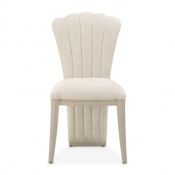 Elevate your daily ritual with the graceful curves and sumptuous textures of the Fantosini Vanity Chair. Its glamorous silhouette—defined by a softly scalloped back and bold vertical channel tufting—evokes timeless elegance with a contemporary flair. Upholstered in a plush cappuccino chenille that blends soft gray and natural hues, the chair exudes understated sophistication. A solid rubberwood frame in a silver mist finish provides a sleek, sculptural base, while welting adds a refined accent to the seat and back.