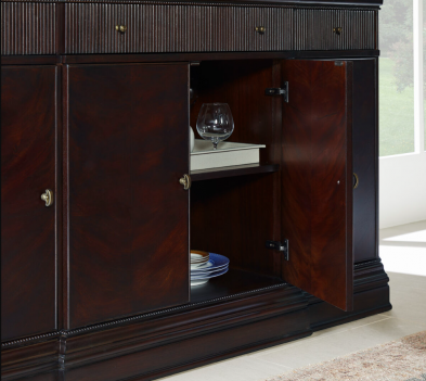 Crafted with meticulous attention to detail, this credenza is designed to elevate your home décor while providing ample storage and functionality. Featuring the staples of our Revival Collection, including a rich mahogany finish, detailed reeding, canted corners and wrap around moldings, this piece makes a lasting impression. Ample storage includes a discreet, felt lined, lift-top compartment and adjustable shelves behind each door for customizable options. With its timeless design and luxurious details, this credenza becomes a statement in any room.