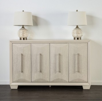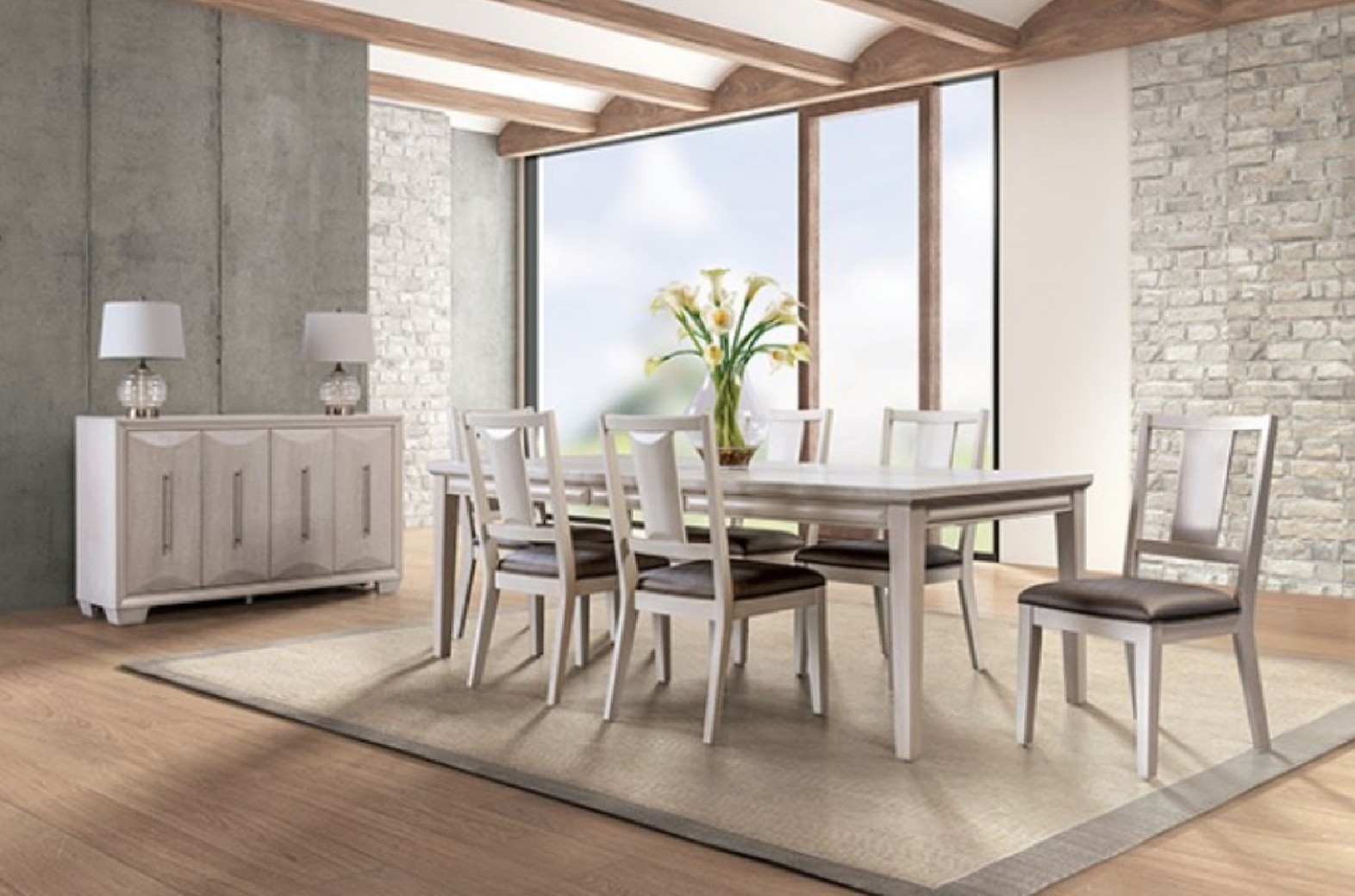 STYLE Transitional COLOR/FINISH White Oak, Espresso MATERIAL Fabric, Solid Poplar & Pine Wood, Oak Veneer, Engineered Wood FEATURES Faceted Panel Back Chair, Padded Seat, Soft Closing Server Doors