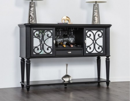 FEATURES Upholstered Seats, Turned Fluted Legs, Silverware Tray Storage & Wine Rack on Server