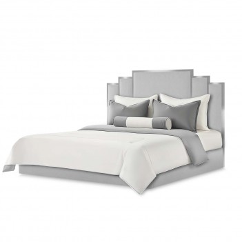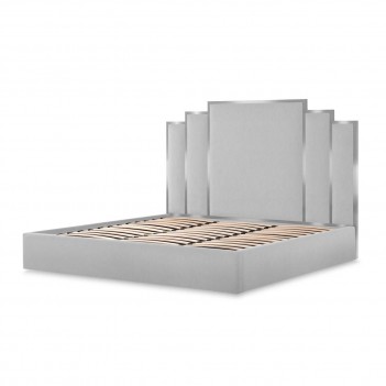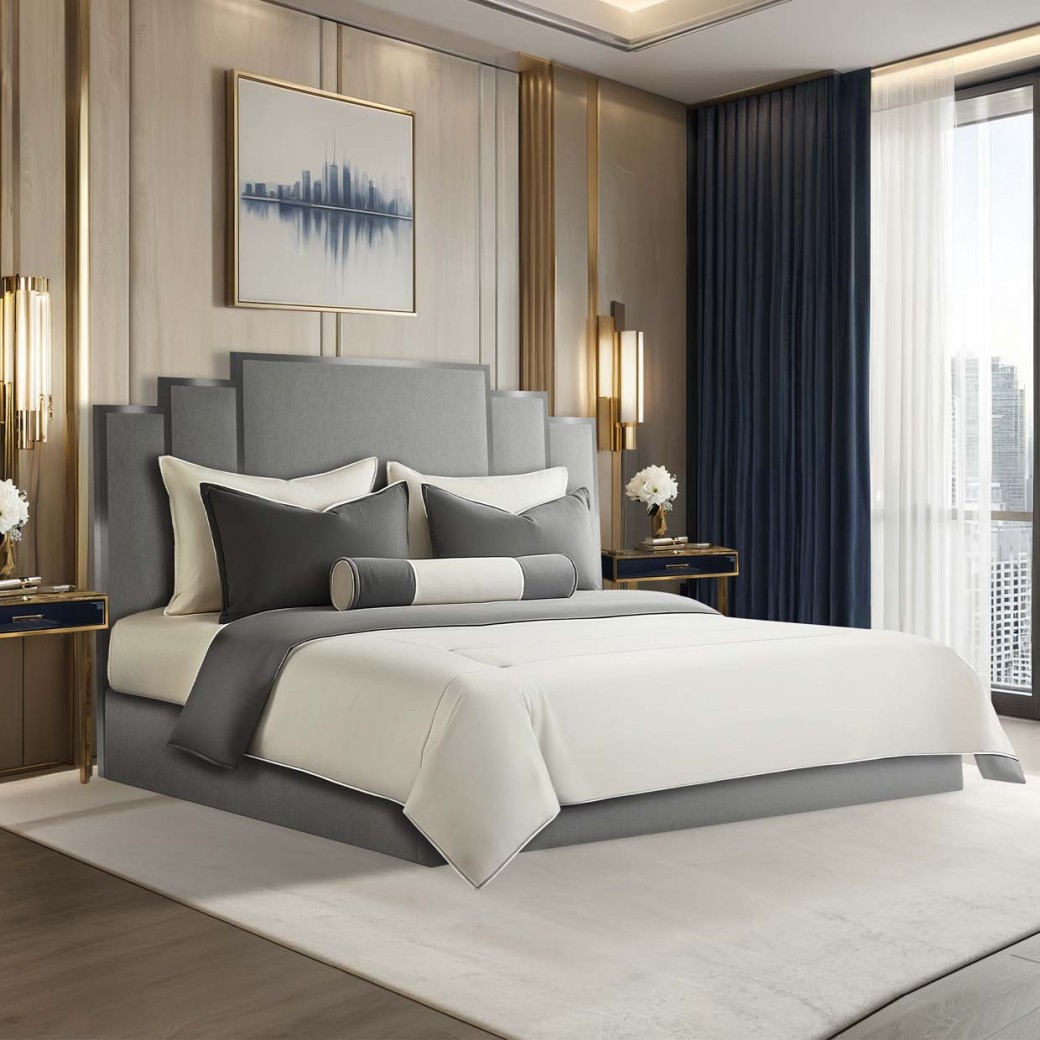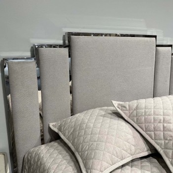 Headboard with Chrome Accents: Features a stepped silhouette with vertical paneling, framed in sleek chrome metal for a subtle touch of modern glamour.