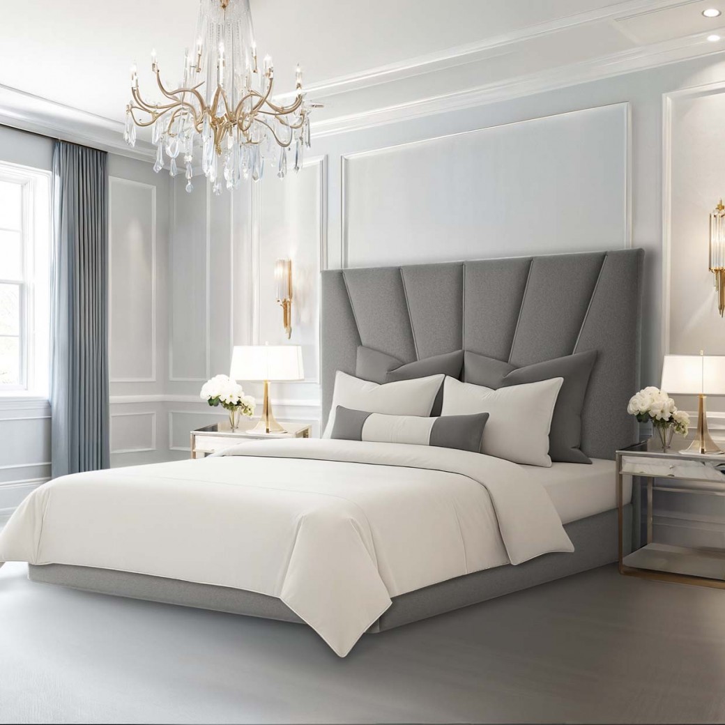 Headboard with Chrome Accents: Features a captivating sunrise design enriched with sleek chrome inlays, bringing a sophisticated touch of contemporary glamour.
