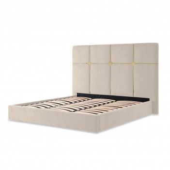 The Zennia Bed blends understated elegance with modern sophistication. Upholstered in soft ivory velvet, its geometric panel design is accented by sleek stainless-steel details that add a refined touch. The lift mechanism provides practical under-mattress storage, making this bed both stylish and functional.