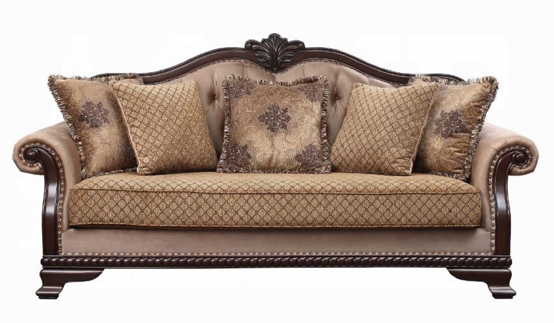 The Chateau De Ville sofa set surrounds you in a warm and cozy embrace. Wood carved details with nail-head accent embody a timeless look with an old world flair. Floral decorative pillows and upholstered cushions with tufted details soften the whole construction, infusing luxury and comfort into the sofas. The sofa set uses pocket coil spring in the construction of seat cushions for extra support and durability while removable cushion and back cover for easy disassembly and cleaning. Comfortable, inviting, and full of style, the Vomoldrot sofa set will be an alluring focal point in any living room.